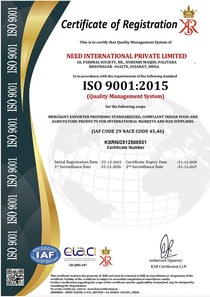 Need International Pvt. Ltd. (NIPL) is a growing export company dedicated to delivering India’s finest products to global markets. From frozen fruits and frozen vegetables to spices, grains, millets, and eco-friendly bagasse tableware, we ensure quality, purity, and reliability in every shipment. Guided by our belief — Your Need, Our Responsibility — we focus on ethical sourcing, timely delivery, and building long-term B2B partnerships based on trust and transparency.